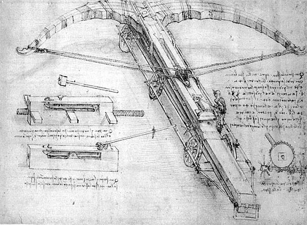 Leonardo da Vinci bedacht niet alleen het vliegtuig, de fiets en de closetbril, maar ook veel oorlogsmaterieel, zoals deze reusachtige kruisboog.