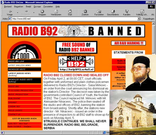 | Rijen vluchtelingen verbeelden het leed van Kosovo en overheersen in de westerse media. Maar wat gebeurt aan de andere kant van de grens? Niemand weet het, want Milosevic snoert de media vakkundig de mond. De onafhankelijke Joegoslavische radiozender B92 is tot zwijgen gebracht. Monnik Sava Janjic (inzet) verspreidde vanuit het Decani-klooster in Kosovo Internet-berichten, maar ook dat is inmiddels onmogelijk gemaakt. |
