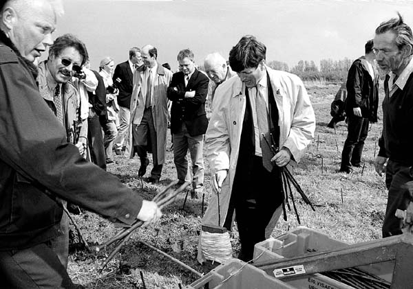 | Gedeputeerde Dijksma (m.) van de provincie Flevoland poot wilgenstekken in een weiland onder een hoogspanningsmast. Hout uit dit snel groeiende hakhoutbos moet over 4 jaar een energiecentrale voeden in Lelystad. Het 'energiebos' draagt daardoor bij aan de vermindering van de CO2-uitstoot in de atmosfeer.