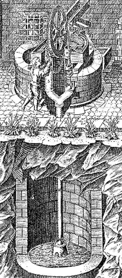 Een houtsnede van een zuigpomp boven een waterput, uit een boek van Agostino Ramelli uit 1588. Ramelli is een van de eerste auteurs die doorsneetekeningen van pompen publiceert.