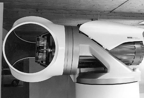 De turbine van de Winergy5000 van Flender heeft een lengte van ongeveer 3 meter en een doorsnee van nog geen meter, en levert een vermogen van 5 megawatt.