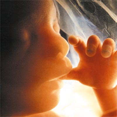 ![]() | Als een borduursel gewrocht... Dit embryo is 18 weken oud en 20 centimeter lang. Zodra een van de vingers de lippen aanraakt, treedt een zuigreflex op. De Zweedse fotograaf dr. Lennart Nilsson was de eerste die foto's maakte van levende embryo's in de baarmoeder.