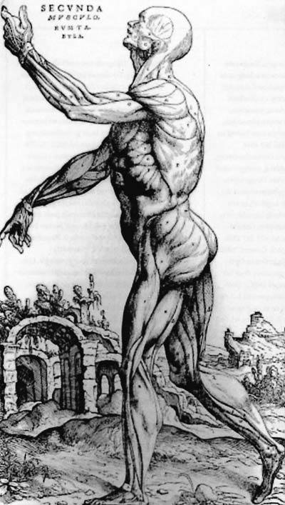 Een spierman, houtsnede uit het beroemde anatomische boekwerk van Andreas Vesalius. Het is vervaardigd door de kunstenaar Johannes Stephanus van Calcar.