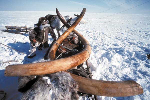 Op het Siberische schiereiland Taymir, 220 kilometer van de bewoonde wereld, heeft een nomadenfamilie een wolharige mammoet aangetroffen. Deze familie Jarkov heeft de stoottanden van het dier opgegraven en vervoert ze op een rendierenslee.