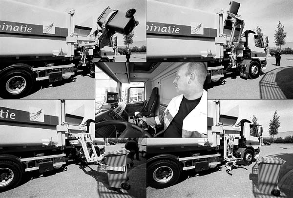 | In het buitengebied van Ede rijdt sinds kort een bijna volledig automatische vuilniswagen bediend door één man. De wagen moet op het juiste moment stoppen. Een arm schuift uit (rechtsonder) en twee klemmen pakken de huisvuilcontainer vast (linksonder). Daarna brengt de arm de container met een zwaai op zijn kop boven de vrachtwagen (boven). Chauffeur-bediener A. van Harn volgt alles via een monitor in zijn cabine (midden).