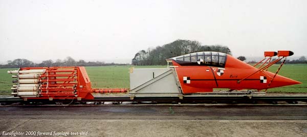 Een nieuw type schietstoel moet uitgebreide proeven ondergaan. Hier de testslede van Martin-Baker in Noord-Ierland. Op de foto staat een model van het Europese gevechtsvliegtuig Eurofighter Typhoon.