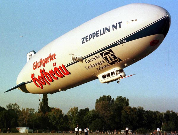 Archieffoto van de proefvlucht van een zeppelin in Friedrichshaven in 1997. De politie overweegt een zeppelin in te zetten tijdens het Europees Kampioenschap voetbal, dat volgend jaar in Nederland en België wordt gehouden.