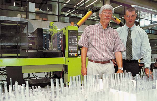 | H. Simons (l.) en P. Toonssen voor de spuitgietmachine in een hal van TNO Industrie. De machine is uitgerust met een onderdeel dat dikke kunststof producten voorziet van een gasbel. Op tafel het resultaat van een grote reeks experimenten. Foto N. Minneboo |