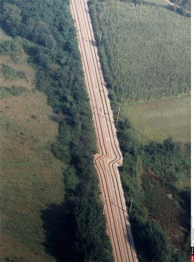 ![]() | Een kenmerk van veel aardbevingen is dat de aarde verschuift. Deze spoorlijn tussen Izmit en Adapazari vertoont een knik omdat de bodem ongeveer 2,5 meter verschoven is. Vaag is links en rechts van de spoorlijn het breukvlak van de aardbeving te zien.