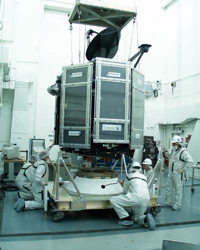 Wetenschappers maken de QuikSCAT-satelliet met bovenop de zwarte schotel van de SeaWinds-radar, gereed voor de lancering. De radar volgt een ijsberg die een drukbevaren scheepsroute langs Zuid-Amerika in gevaar brengt.