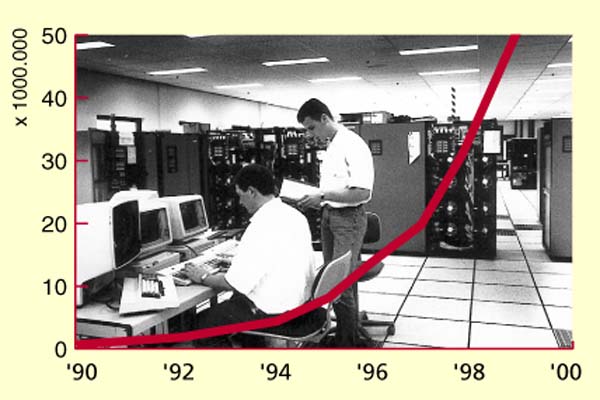 | Bij de 'geboorte' van Internet, dertig jaar geleden, werden twee computers van koelkastformaat met elkaar verbonden. Inmiddels is een mobiele telefoon voldoende. De grafiek laat de sterke groei van Internet gedurende het afgelopen decennium zien. De linkeras geeft het aantal computers aan dat informatie via Internet aanbiedt. |