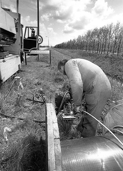 ![]() | De groei van het Internet-verkeer leidt ertoe dat er meer en dikkere kabels nodig zijn. Om internationale verbindingen tot stand te kunnen brengen, worden kilometerslange glasvezelkabels over de zeebodem aangebracht. Foto: een medewerker van een kabelinstallatiebedrijf is bezig met de aanleg van geblazen glasvezelkabels.
