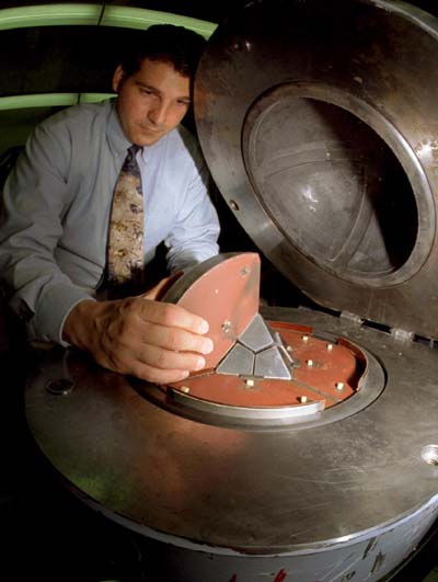 ![]() | Deze machine zet koolstof en een snipper diamant onder hoge druk en bij hoge temperatuur om in kunstdiamant. Russische en Amerikaanse wetenschappers ontwikkelden het apparaat. Volgens hen zijn de kunstdiamanten niet van echte te onderscheiden.