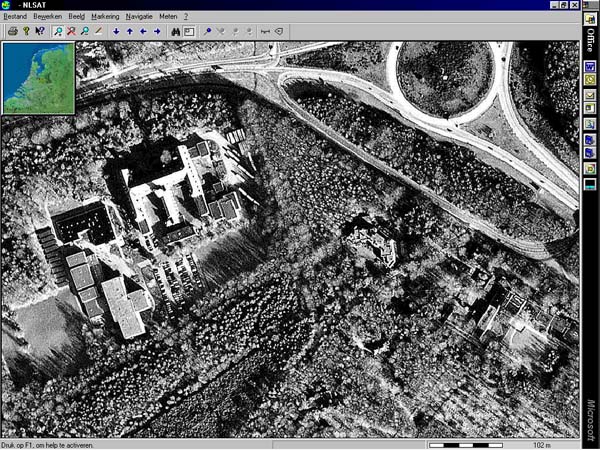 | Locatie Amersfoort van het Van Lodensteincollege, gekiekt door de Russische spionagesatelliet Cosmos. Uitgeverij Denda Multimedia zette satellietfoto's van Nederland op een cd-rom. Het schoolgebouw is weergegeven in de sterkste vergroting; auto's zijn nog waar te nemen. Het schaalstokje rechtsonderin is 100 meter. |