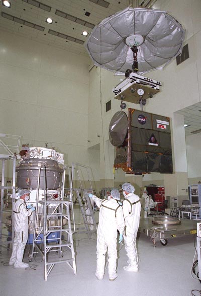 De Mars Climate Orbiter, rechts op de foto, kort voor de lancering in december 1998.