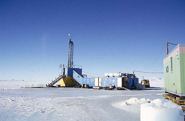 Een boortoren op het zee-ijs bij Cape Roberts op Antarctica. De boortoren staat op een laag zee-ijs van ongeveer 2 meter dik en boort in de zeebodem bij een waterdiepte van 295 meter.