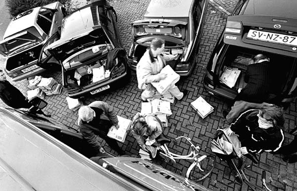 Graaien in de verse kranten. Hoofdroute-expediteur J. Bayense brengt de pakketten vanuit Apeldoorn in Alblasserdam, waar vier expediteurs ze verdelen over de bezorgers in die regio.