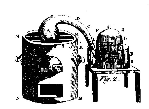 | Met zo'n opstelling toonde Lavoisier aan dat metalen zoals fosfor en zwavel bij het verhitten oxideren. Links een warmtebron met een kolf met de metalen erin; rechts een glazen stolp in een bak water waarmee hij kon meten hoeveel zuurstof de reactie verbruikte. |