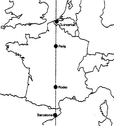 ![]() | Om de exacte lengte van de meter vast te stellen, bepaalden landmeters aan het eind van de achttiende eeuw de afstand tussen Duinkerken en Barcelona en berekenden op grond hiervan hoe groot de afstand van de Noord- tot de Zuidpool is. Op 10 december 1799 is bepaald dat het twintigmiljoenste deel daarvan precies 1 meter is. |