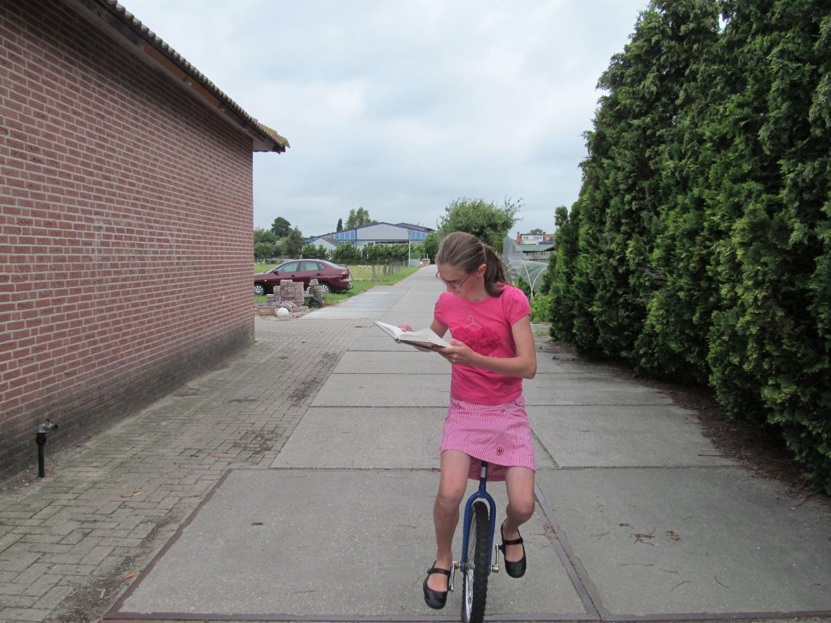 Ten tweede levert het rust op. Wie wil er nu tijdens een avondwandeling ingehaald worden door een zogenaamde discojogger? Geef mij dan maar een andere rage. De eenwieler: zo'n fiets zonder stuur, met één wiel. Het is goed voor je evenwicht, zowel lichamelijk als psychisch. Zeg maar fysiek balanceren gecombineerd met humor en ontspanning. Neem een dag tijd om het te leren en incasseer wat blauwe plekken. Je krijgt er een balansdag voor terug. Geen taart die je er voor hoeft over te slaan. Sonja ten spijt. Deze rage mag er zijn. Liefst langdurig.
