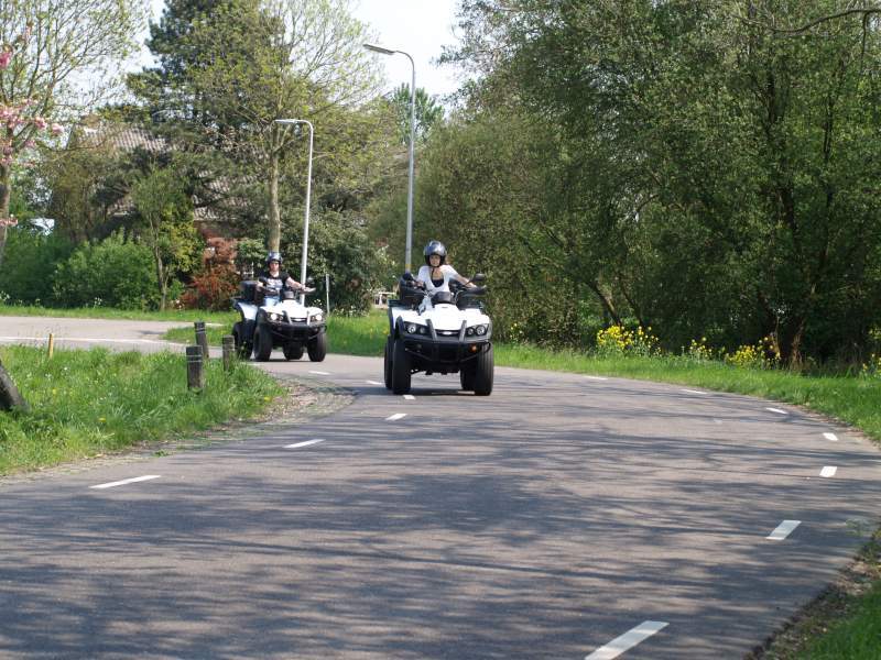 De tocht gaat vanaf Bodegraven haast continu door een waterrijke en groene omgeving. Langs vaarten, kanalen en sloten. Langs geurig bloeiende bomen en ontelbare wilgen. Een paar schapen kijken lodderig op als de quads langsschieten. Haastig zwemt een meerkoetje weg als de machines passeren. Het geluid van de motoren overstemt het gekwaak van vele kikkers.