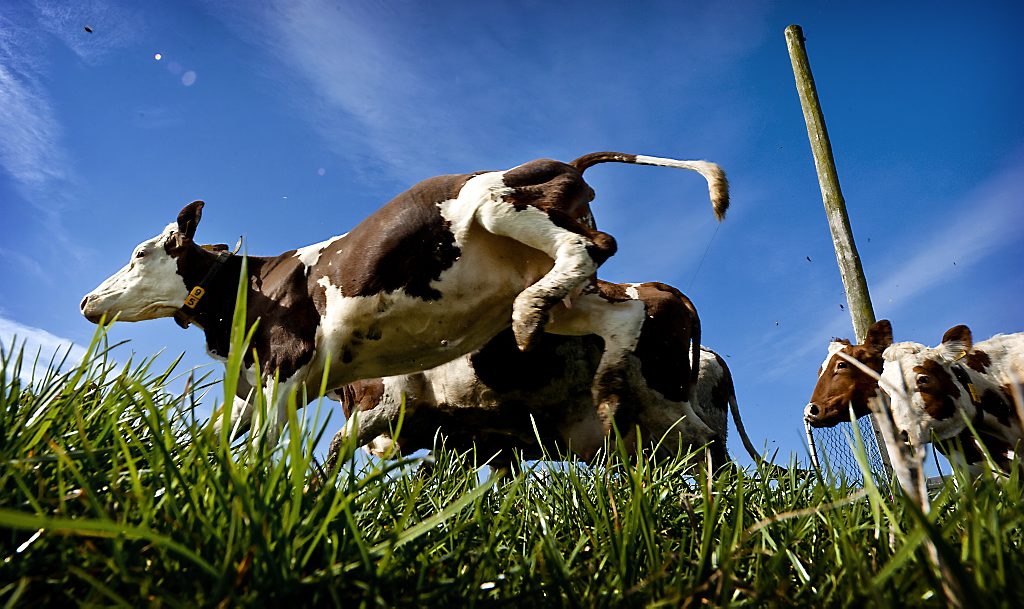 De brandweer moest het bad helemaal leegpompen om de koe met een takel weer op het droge te krijgen. Het beest hield aan de ‘spontane duik’ en het takelwerk geen letsel over en staat weer in de wei.