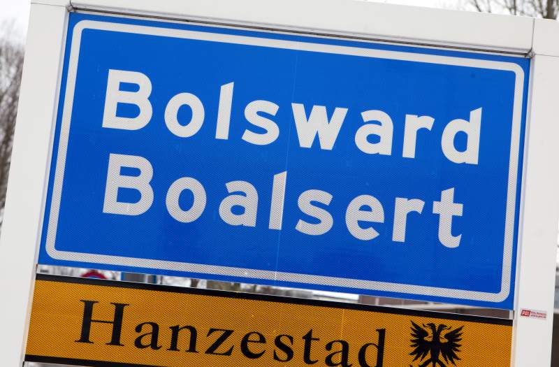 De borden zijn vanwege de korte naam Bolsward te klein om er tijdelijk de nieuwe gemeentenaam op aan te brengen.