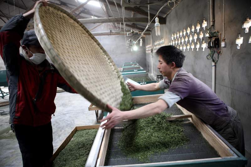 De lente begint weer. Veel boeren in China starten met het oogsten en drogen van groene thee.