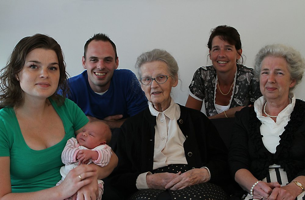 Op de foto zittend: moeder Tineke van den Berg-van Velthuizen (23), dochter Mearle, overgrootmoeder Mieke Hazeleger-van Dijkhuizen (65), betovergrootmoeder Clara van Dijkhuizen-van Engelenhoven (91). Daarachter: vader Wilbert van den Berg (25) en oma Klaske van den Berg-Hazeleger (44).