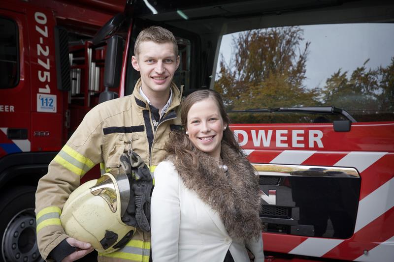 Dat komt ook naar voren als er verliezen worden geleden. „Heftige gebeurtenissen maak je gewoon mee. Wij bespreken ze altijd uitgebreid binnen het team. Je moet er als vrijwillig brandweerman niet mee gaan lopen. Ik merk zelf dat ik ze deels in stilte verwerk, maar als het nodig is praat ik met collega’s.” En met een lach naar zijn verloofde: „Of met Reinike natuurlijk.”