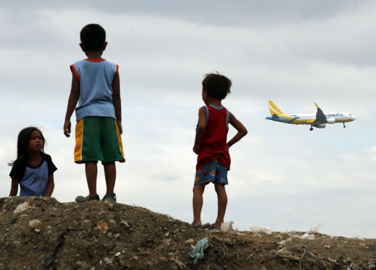 Het toestel van Cebu Pacific, kleurrijk als de kinderkleding, zet onvervaard de landing in. Rijk daalt af naar arm. Arm mag kijken, en het oog wordt niet verzadigd van zien.
