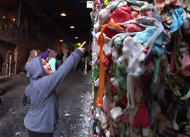 Aan de muur –ooit de op één na vieste plek ter wereld met de meeste bacteriën genoemd– kleven naar schatting één miljoen stukjes kauwgom. De laag is ongeveer 15 centimeter dik.