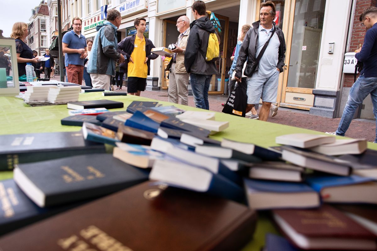 Allerlei groepen presenteerden zich maandagmiddag aan nieuwe studenten tijdens de kennismakingsweek in de binnenstad van Leiden. Kerken maakten van de gelegenheid gebruik om Bijbels uit te delen (zie foto).