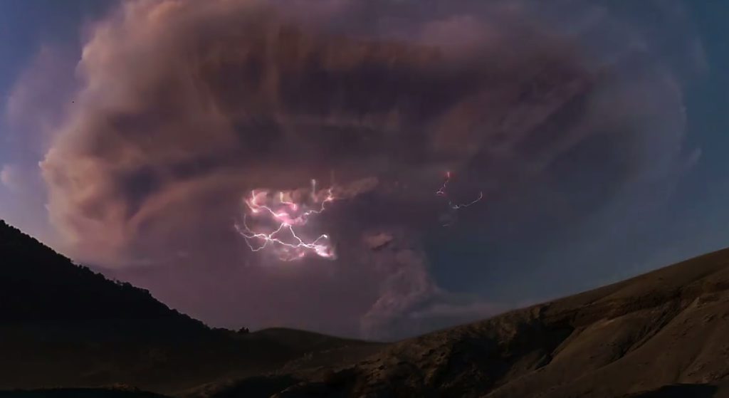 De droge as spuwt met grote kracht uit de vulkaan, waardoor elektrostatische ontladingen ontstaan.