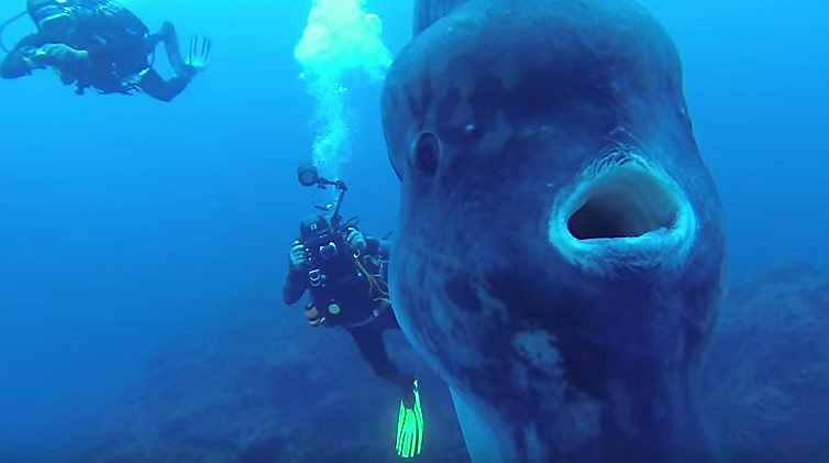 Het heldere water en de langzaam bewegende vis zorgen voor prachtige beelden. De vis lijkt niet te worden gehinderd door de duikers zodat die een 15 minuten durende video konden maken.
