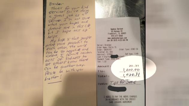De ober had een gesprek met de man, terwijl hij hem bediende in het Smokey Barque BBQ restaurant in het Amerikaanse Frankfort. Daar was de tiener net komen werken. Pas toen de weldoener het restaurant had verlaten, zag Brendan de hoge fooi met een briefje liggen. "Mijn mond viel open. Ik kon niks meer doen. Ik was in shock."