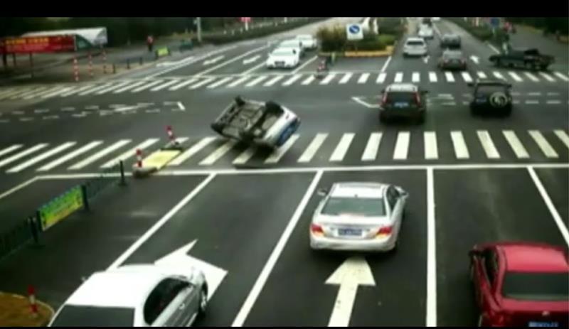 Een taxichauffeur in de Chinese stad Ningbo kreeg op een wel heel knullige manier zijn auto ondersteboven.