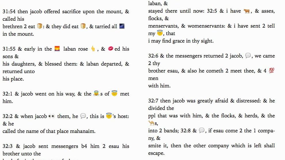 De maker van de Emoji Bible –alleen beschikbaar in het Engels– nam de King James Version als uitgangspunt. Hij zette alle teksten om in emoji’s. Dat kostte hem zes maanden. Via Twitter deelde hij teksten, om reacties te peilen. Die waren veelal positief.