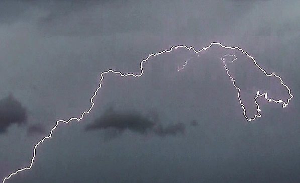 “Deze bliksemschicht lijkt op een Tyrannnosaurus rex die een hap uit de heuvels wil nemen”, zo luidt het bijschrift.