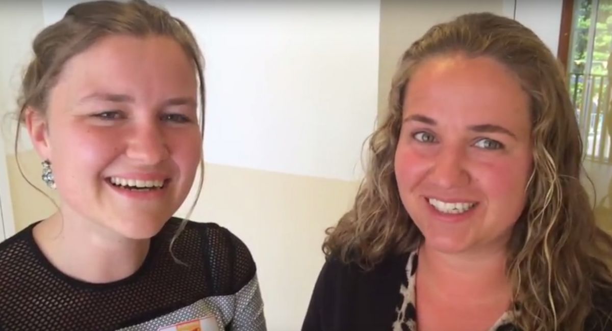 Twee meisjes van de reformatorische Petrus Dathenusschool staan vooraan bij het dranghek. Rebecca Bakker en Anne-Gré Visscher houden een bord omhoog. „Lieve koningin, wij houden vandaag onze spreekbeurt over het koningshuis. Wilt u even met de klas op de foto?”