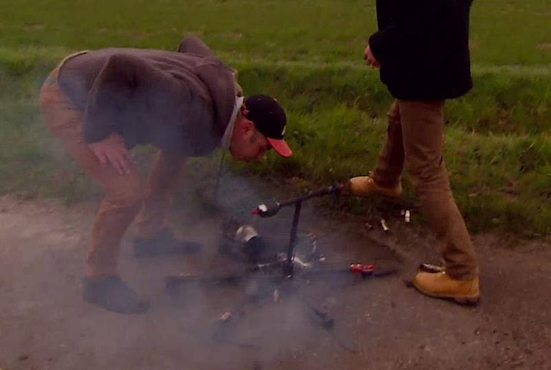 Na een succesvolle tussenlanding om de lege accu te vervangen ging het mis. Van niet al te grote hoogte stortte de drone neer en ging in vlammen op.