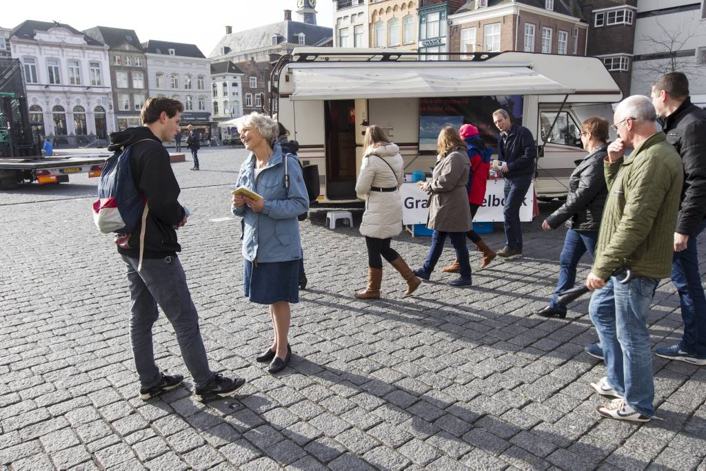 Buiten worden er folders uitgedeeld, mensen aangesproken. Het ene gesprek duurt nog geen drie seconden, het andere wel vijf minuten.