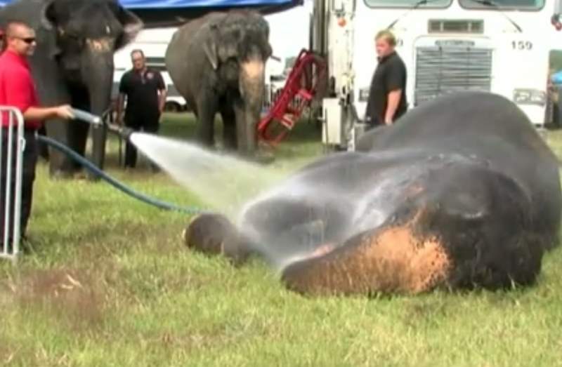 Even een ander klusje voor de Amerikaanse brandweer in Missouri. Geen brandjes blussen, maar olifanten wassen.