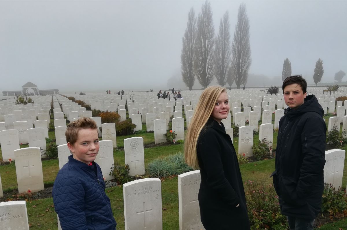 Op de foto: Nathan Roos, Mirjam Beumer en Tim Wilsing bezochten de Tyne Cot Cemetery in België.