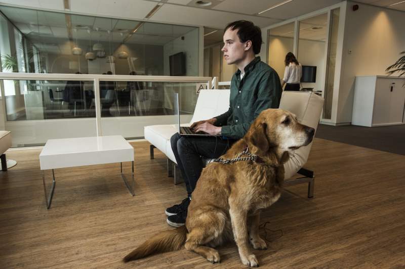 Om zijn weg te vinden op straat, op de universiteit en zijn stageplek, heeft De Jong een blindengeleidehond.