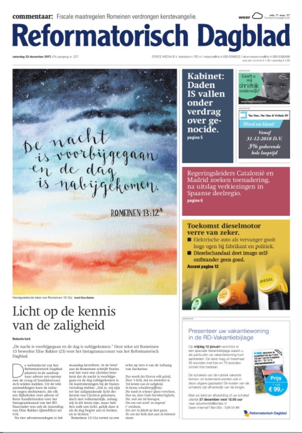 De webredactie van het RD plaatste in de aanloop naar advent een oproep met de vraag of handletteraars zich wilden melden. Uit de vele aanmeldingen koos de redactie negen deelnemers, die elk een Bijbeltekst over advent of Kerst handletterden voor het Instagramkanaal van het RD. Daaronder was ook de inzending van Elise Bakker (@mellilys) uit Urk.
