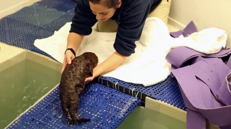 In het Shedd Aquarium wordt ze goed verzorgd, krijgt ze een bad en drinkt ze uit de fles. Het filmpje van de aandoenlijke babyotter wordt op Amerikaanse sites veel gedeeld.
