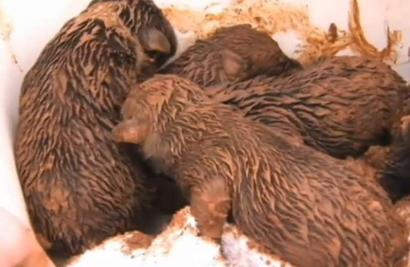 Daar wilde de moeder niet onder vandaan komen, ondanks hevige regenval. Daardoor zaten de honden helemaal onder de modder. Desondanks hebben ze dieren het allemaal overleefd.