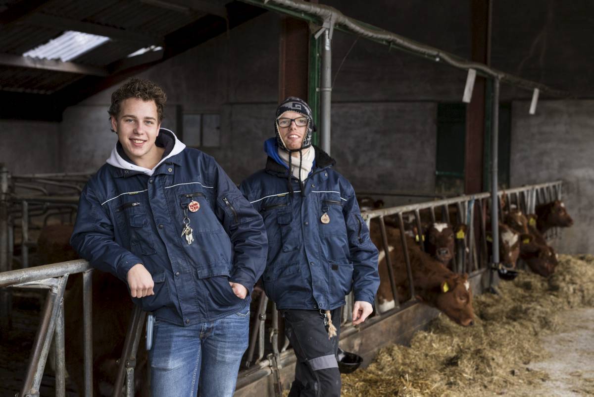 Foto: Henk-Jan Tippe, student van het Hoornbeeck College in Apeldoorn, loopt stage op de Kroonhoeve in Uddel. Hier werkt hij met Wim Henk (r.), een van de cliënten van de activiteitenboerderij. Hij geniet van het werk: „Elke dag is verrassend.”