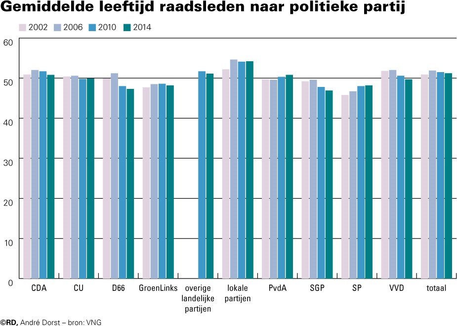 In 2016 was slechts 7 procent van de CU’ers in de raad jonger dan 30. De gemiddelde leeftijd van raadsleden –49,9 jaar in 2014– veranderde nauwelijks aan het begin van een raadsperiode. „In sommige gemeenten, zoals nu in Vianen, is het lastig om mensen te vinden”, legt Van der Zande uit. „Jongeren gaan studeren en trekken weg, en daarom blijven veel ouderen zich inzetten voor het gemeentelijk bestuur. Dat houdt de gemiddelde leeftijd hoog.”